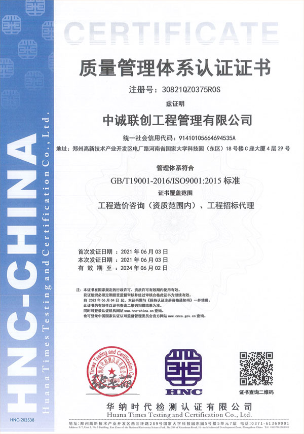 质量管理体系认证证书--工程造价咨询、工程招标代理