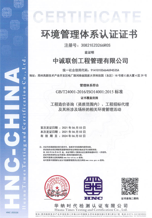 工程造价咨询、工程招标代理及其所涉及场所的相关环境管理活动--环境管理体系认证证书